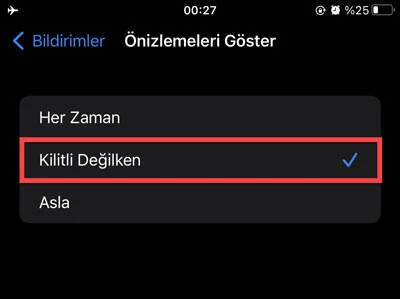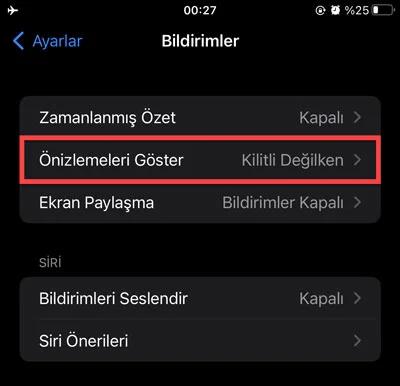 - Ayarlar > Bildirimler > Önizlemeleri Göster Seçelim.