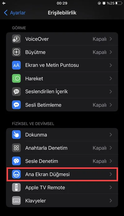 - Daha sonra Ayarlar > Erişilebilirlik > Ana Ekran Düğmesi seçelim.