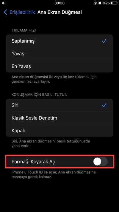 - En altta Parmağı Koyarak Aç seçeneğini devre dışı bırakalım.